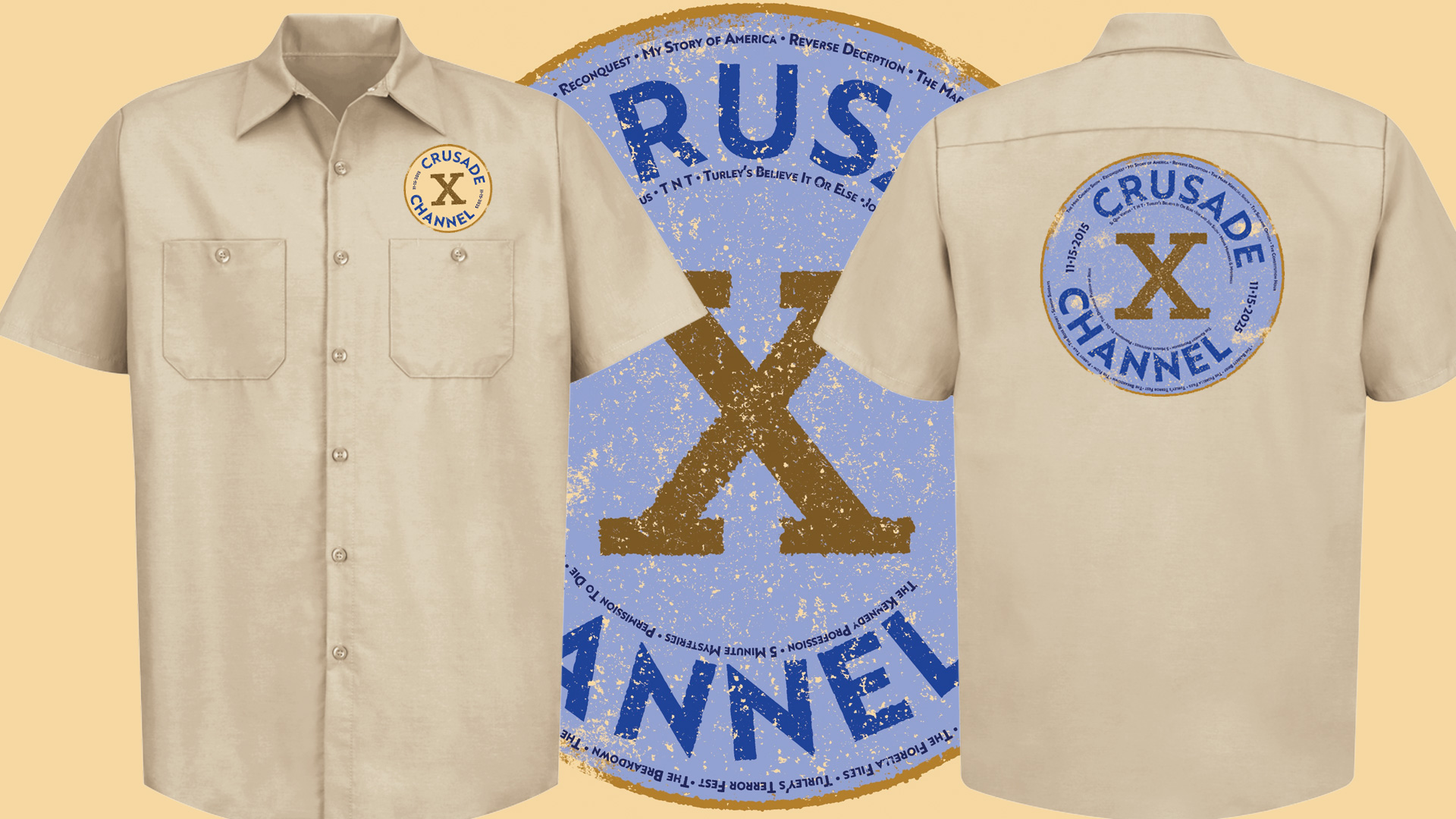 10th Anniversary Crusade Channel Limited Edition T-Shirt designed by Mike Church himself. The design employs old school graphic artist “distressed look” techniques and was 100% conceived, laid out and drawn by Mike. The design’s highlight includes the name of every live and original show that aired on The Crusade Channel over the course of tit’s miraculous 10 year run! A MUST-HAVE for Crusade Channel fans of all ages and tastes! When this limited edition run is sold out, it is sold out son reserve yours today!